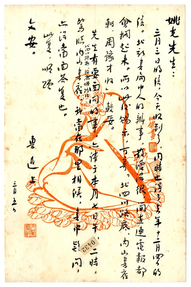 现存第一封鲁迅致姚克短简,写在印有橘色线条、垂目静思的弓背罗汉的笺纸上,从抱怨北新书局办事散漫开始说起。看得出,这位姚克先生在一九三二年十二月四日给鲁迅先生写过一封信,委托北新书局转交。未曾想,载着满满期待的信笺静待了三个月,无人关注。三个月后,鲁迅又连着收到姚克两封来信,于是,立马给了对方确切的通讯地址,定了见面地点,要当面答复对方信中所提出的关于一本书的疑问。