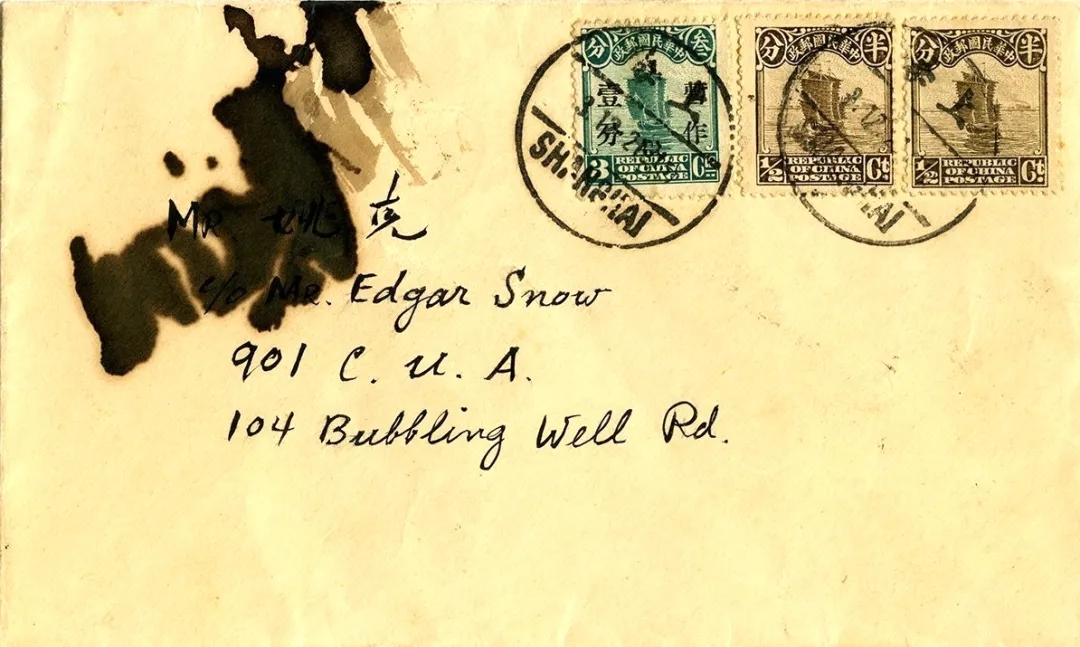 除了三十三封信笺,另有几个已经找不到当年信笺的空信封,其中一件用毛笔竖写着“本埠麦特赫斯托路四十巷第七号 姚莘农先生 周寄 五月二十八日”,比普通信封略大,像是寄贺卡用的。另一件用小楷毛笔横写着静安寺路的英文地址,虽然不小心被墨汁弄污,仍可辨认出姚克中文名与Edgar Snow的英文名共俱其上。最后一件,用钢笔竖写着“棋盘街商务印书馆编译部 姚莘农先生 周乔峰 寄 六月二日”。