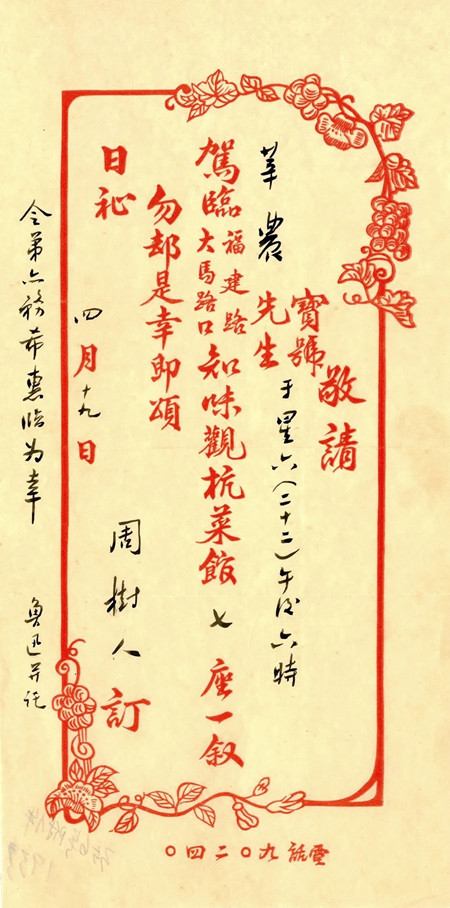 第一次共饭一周后,即四月二十二日,鲁迅张罗了知味观的宴请,是对姚家兄弟的回请,也是将姚克介绍给上海文坛的特意安排。鲁迅在自己设计的请柬上写下“令弟亦希惠临为幸 鲁迅并托”。姚克回忆在场的有茅盾、黎烈文、田汉、丁玲、郁达夫、楼适夷等十几位当时的文坛名家。同去的姚志曾晚年更追忆了先生席间谈话的风采——先生兴高采烈,纵谈时事,锋利地抨击权门、市侩,语调激昂,甚至站立起来,脱去长袍,只穿着短袄和毛背心,提高嗓门,继续谈论。先生特别提到“吊膀子”一词,让在座者感到十分新鲜。后来写到《新秋杂识三》里边,发表于《申报·自由谈》。那次宴请后,结识了黎烈文的姚克在《申报·自由谈》先后发表了《美国人目中的中国》《读古书商榷》《北平印象》等文章,鲁迅在书信中均郑重告知自己曾认真读过。由此可见,先生是如何真诚热心地鼓励和提携文学青年。