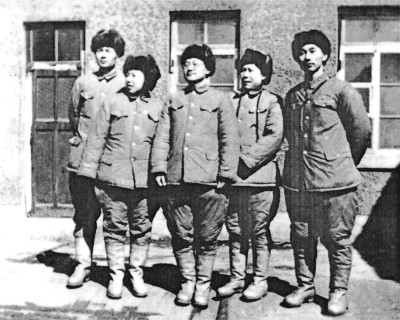 1952年3月11日部分赴朝创作组成员在沈阳东北军区招待所门前合影。左起:李蕤、逯斐、巴金、菡子、黄谷柳。