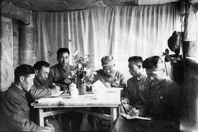 1952年5月,李蕤在188师指挥部坑道中采访。右起:李蕤、188师师长张英辉、副政委陈英、政治部主任弃里三、政委李真、副师长徐成功。