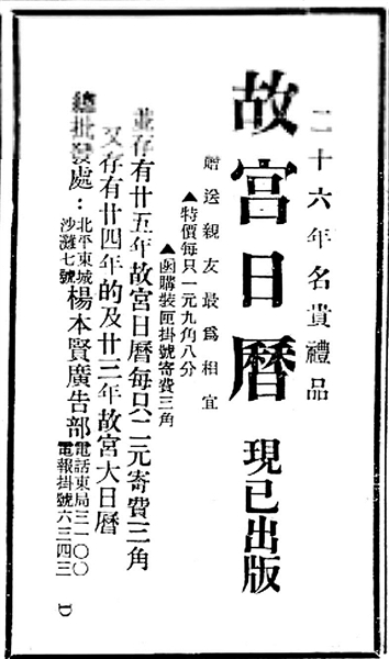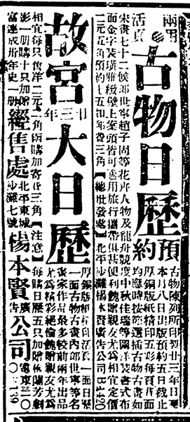 “故宫大日历,厚铜版纸精印活页,一面日历,一面古物(古画内郎世宁等名画家作品最多),较前两年出品尤为精彩绝伦,馈赠亲友尤为相宜。每只售洋二元二角,函购加寄费三角。【注意】每购日历五只,加赠《梅兰芳剧影》一册,购十只加赠《富连成卅年史》一册。经售处:北平东城沙滩七号杨本贤广告公司。”