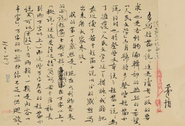 茅盾在1958年写下了一篇名为《谈最近的短篇小说》的评论文章,载于当年的《人民文学》第6期。这篇文章的手稿共30页,全部用毛笔写成,每页纸张长22厘米,宽15厘米,除了纸质微微泛黄外,品相甚好,还附有当时刊发该文的《人民文学》发稿签。这篇9000余字的文学评论,由于在特殊的历史时期,文中所涉及的多篇作品,经由茅盾先生的精准而有力的评论,成为中国当代文学的经典作品,比如茹志娟的《百合花》、王愿坚的《七根火柴》等9篇作品进行评论,每一篇评论都用作品事实说话,详略得当、切中要端,既有肯定,也指出不足。其中,他更赞赏《七根火柴》和《百合花》。
