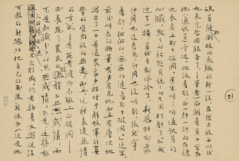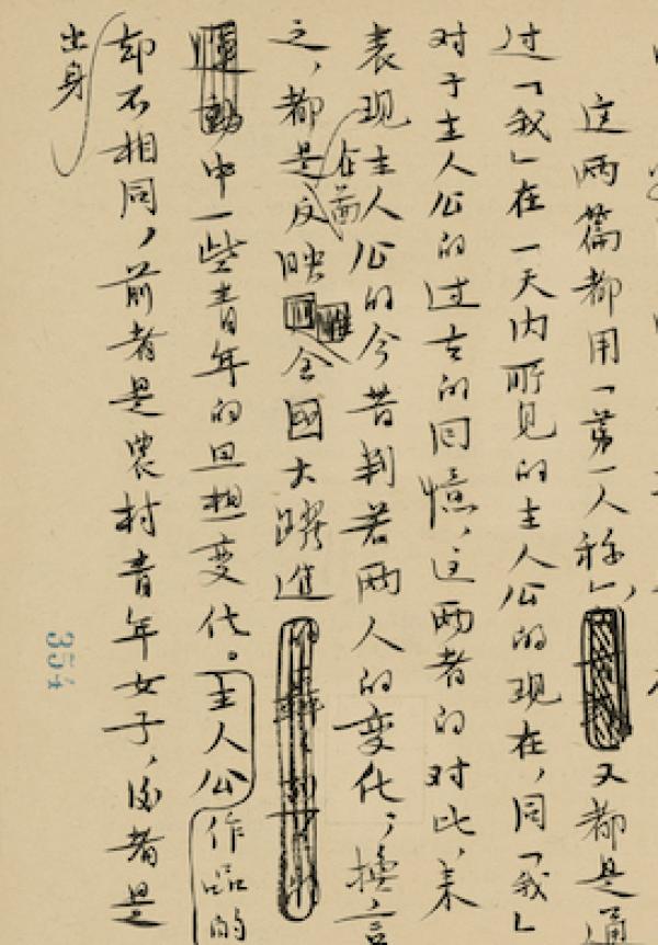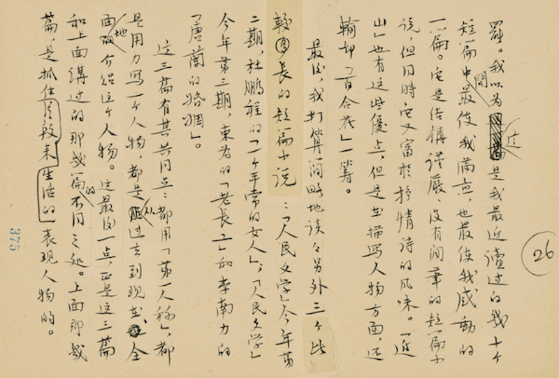 这一手稿是1958年写的,我是搞画史的,对文学史不是太了解,但里面有一个共通的现象,就是文艺为大众服务越来越走向高潮,从这一手稿里面可以看出来。实际上当时有一个大背景,提倡写短篇小说,别人容易看得明白,当时出了一批新作者,主要的目的是贴近生活。实际上从绘画史的话,这些要求在画史里面也存在的,这是可以相互参看的。