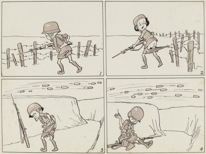 《三毛从军记》很多源自我父亲亲眼所见,所以这套作品1946年在《申报》发表后,很多人都喜欢看。我父亲没有参过军,但是曾多次到最前线慰问当时的抗日部队,知道他们如何抗日、如何打仗的。《三毛从军记》也是中国第一部军旅漫画,甚至后来好多人把他这部作品和捷克作家哈谢克创作的《好兵帅克》相提并论。而且,《三毛从军记》是中国第一部没有文字的长篇漫画。