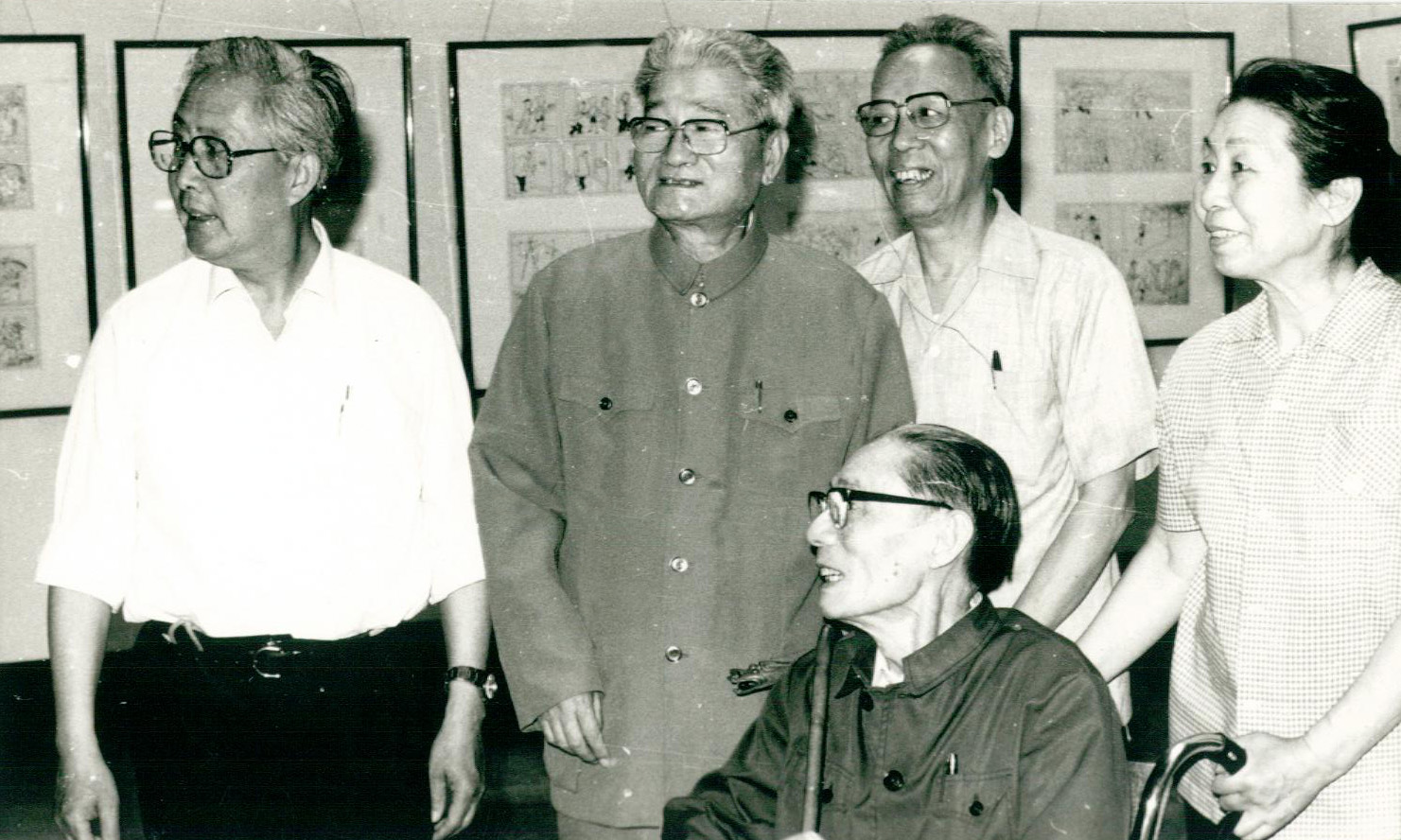 坐者:夏衍;立者(左起):华君武、张乐平、廖冰兄、郁风,摄于1983.6