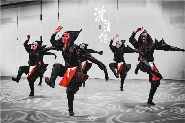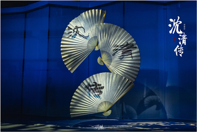 据本剧的总编导之一柯书剑介绍,在舞蹈设计编排上,巨幅折扇的运用,是作为环境移变与剧情转折的提示点和强化点。那么,折扇不仅仅是演员手中的一个道具,更是融入到剧情当中的一个重要角色,承担起了强化舞台空间与剧情演变的功能。比如,当写有“祭” 字的折扇出现时,提示进入沈清要在祭祀仪式中被投入海中的重要情节,瞬间调动观众情绪,扣人心弦。