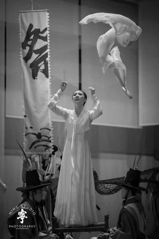 盘索里《沈清传》在“五大索里”中居于首位,另外四部是《春香传》(情)、《兔子传》(忠)、《赤壁歌》(义)、《兴夫传》(勤)。本剧唱段由朝鲜族歌唱家卞英花表演。总编导之一苏娅菲介绍到,本剧中“盘索里”演唱是一次不同于传统唱剧的大胆尝试,将这种浓郁风格韵味的传统艺术与创新性较强的当代戏剧相碰撞,不是简单的伴唱,而是承载着多重功能的艺术表达,打开了更丰富的戏剧空间。“从第三视角讲述故事的‘唱剧人’,用贯穿始终的叙事旁白将动人的亲情与爱娓娓道来,有时又直抵人物内心,将演员的肢体情绪与唱腔的情感张力相融合,共同为人物‘发声’。”