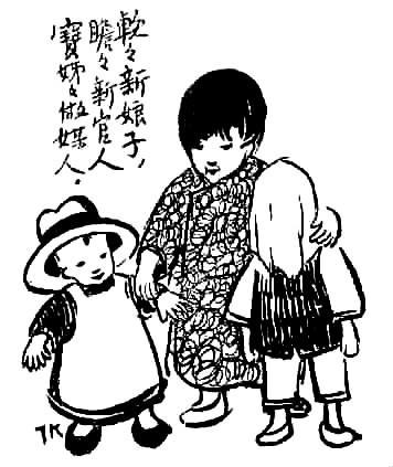子恺先生艺术之独特在另一方面——独树高标,表现童心童趣,抒情融入诙谐,展示了一种美学境界。此类经典之作大多收集于《儿童相》。令人过目不忘者如画孩子持两蒲扇,一前一后,作骑马状,题曰“瞻瞻的脚踏车”;孩子将自己的鞋子垫于四脚圆凳之下,题曰“阿宝两只脚,凳子四只脚”。于儿童经验之局限写其心灵之天真,于不起眼的、平常人视之无所谓的现象中发现童心之美。还有一幅令人印象深刻,三个孩子,一女稍高,立于中,左侧男孩,戴英式礼帽,甚大,右侧女孩,头蒙面布,题曰“软软新娘子,瞻瞻新官人,宝姊姊做媒人”。其事极不现实而孩子极慎重,于儿童显示童心童趣,于画则表现了先生的爱心和幽默。
