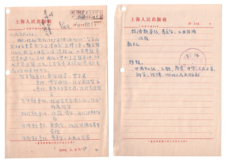 商务印书馆与上海人民出版社关于《亚洲区域与经济地理》事宜的往来登记