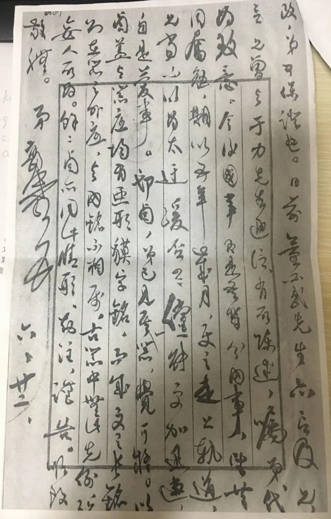 信末落款是6月22日,未属年份。不过从“来平”“鼎革”等字句判断,此信写于1949年无疑。《郭沫若年谱长编(1892—1978)》记载1949年2月25日郭乘“天津解放号”专车于中午12时抵达北平。10月19日被任命为政务院副总理,政务院文化教育委员会主任,中国科学院院长。郭沫若此时还是以朋友身份写作此信,语气和缓,然主人翁心态亦流露无疑,“今后国事即是吾辈分内事,望共同奋勉。”,但因为身份、地位的差异,恐怕丁山不会有此感觉。这封信的发现对认识易代之际的郭沫若、丁山等知识分子的思想动态当不无作用。