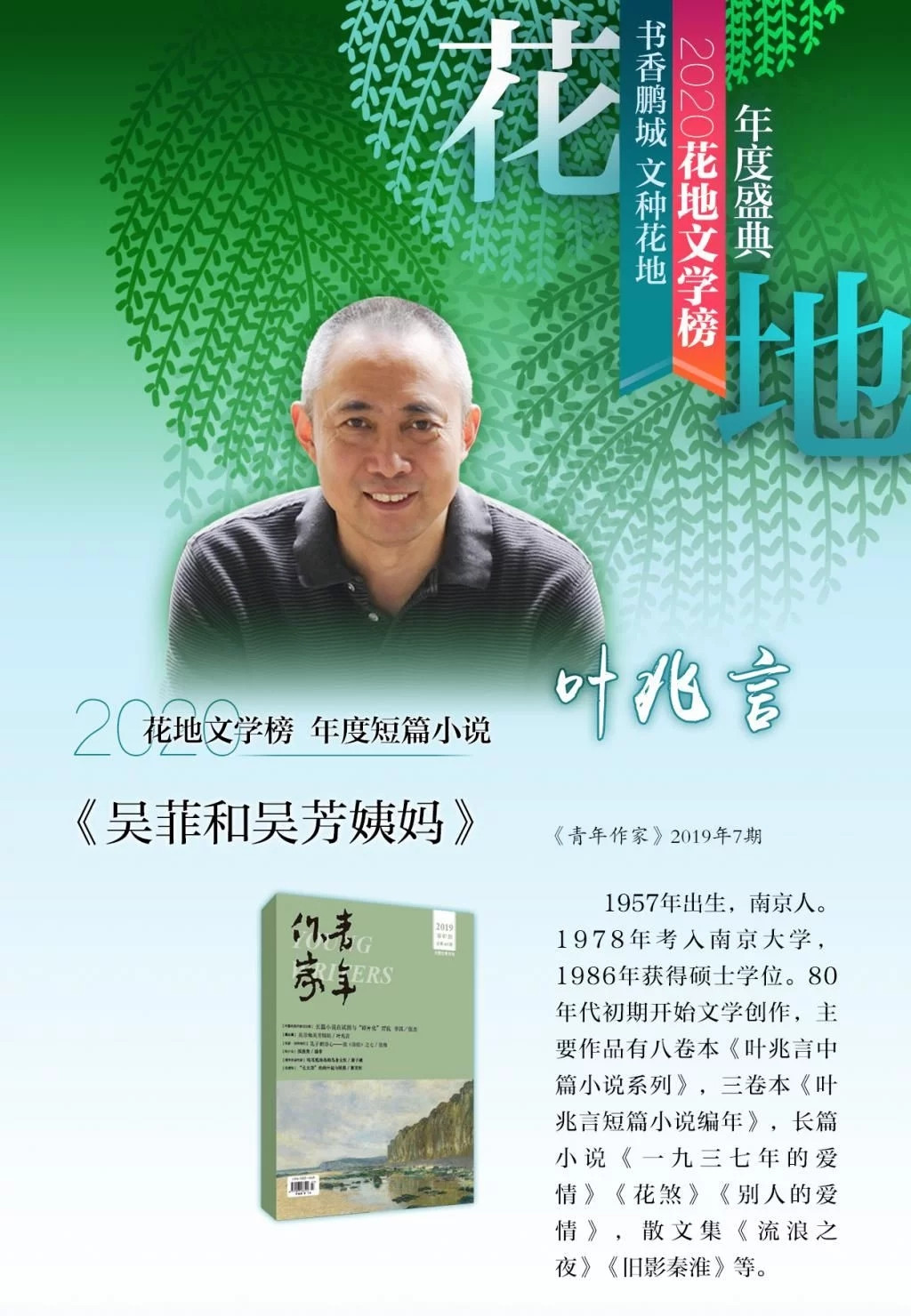 11月23日,2020花地文学榜揭晓,叶兆言《吴菲和吴芳姨妈》(《青年作家》2019年第7期)获得“年度短篇小说”。顾广梅为叶兆言撰写致敬辞:“叶兆言以《吴菲和吴芳姨妈》漂亮地完成了一次有备而来的艺术搏击,也是一次颇具挑战性的写作冒险,他要写出与别人‘完全不一样的短篇小说’。这篇小说不足万言,却将一对双胞胎姐妹跌宕起伏的人生恩怨和无法抗拒的人性纠缠,写得充满命运感、悲剧感。淡然中蕴悲凉,疏离中透关切,短篇小说独有的小与大、轻与重的艺术辩证法得以自如实现。”