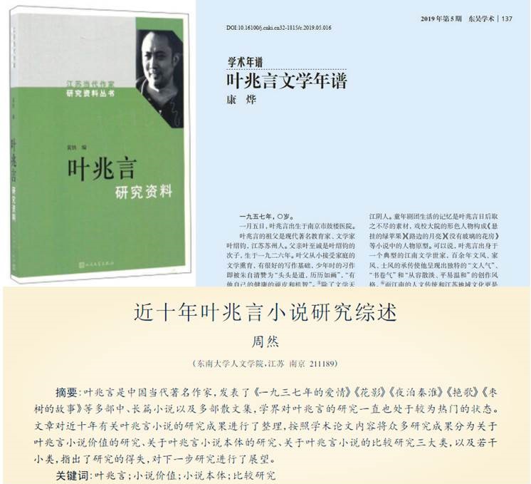 近年来,关于叶兆言的研究成果不断丰富。左上:黄轶编《叶兆言研究资料》人民文学出版社2016年;右上:康烨《叶兆言文学年谱》;下图:周然《近十年叶兆言小说研究综述》。