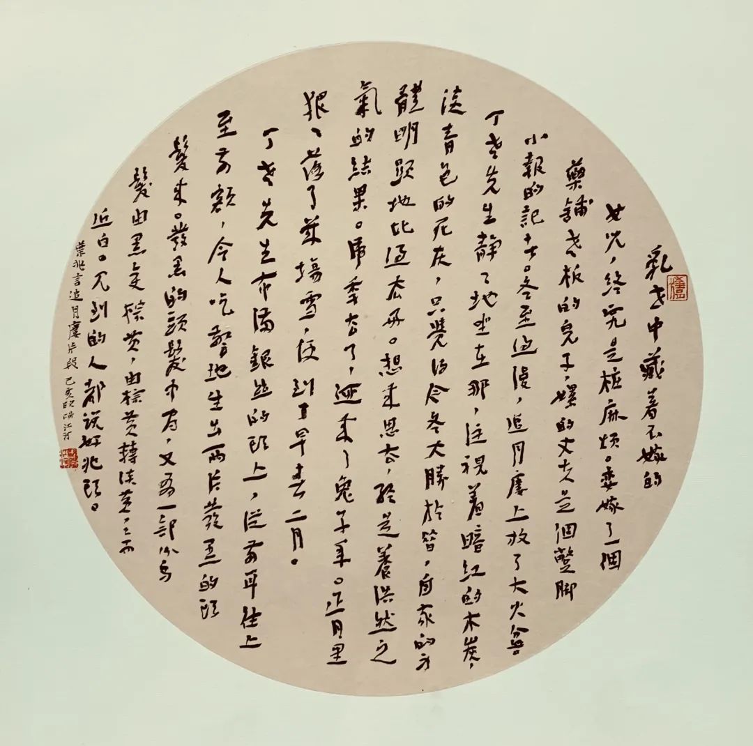 欧阳江河抄录叶兆言《追月楼》中的一段文字,并在研讨会上将书法作品赠送给叶兆言。“乱世中藏着不嫁的女儿,终究是桩麻烦。娈嫁了一个药铺老板的儿子,嫘的丈夫是个蹩脚小报的记者。冬至过后,追月楼上放了个大火盆。丁老先生静静地坐在那,注视着暗红的木炭,淡青色的死灰,只觉得今冬大胜于昔,自家的身体明显地比过去好。想来思去,终是养浩然之气的结果。虎年去了,迎来了兔子年。正月里狠狠落了几场雪,便到了早春二月。丁老先生布满银丝的头上,从两耳往上至前额,令人吃惊地生出两片发黑的头发来。发黑的头发中间,又有一部分乌发由黑变棕黄,由棕黄转淡黄,黄而近白。见到的人都说好兆头。”