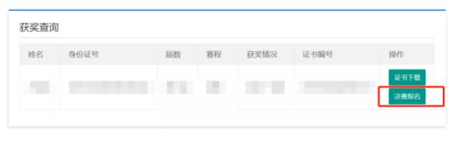 在初赛中获得省级一等奖的选手可报名参加决赛,决赛报名选手登录大赛官网“个人中心”,在“获奖查询”栏目点击“证书下载”完成照片上传,经组委会审核后,点击“决赛报名”按钮,完成决赛报名。