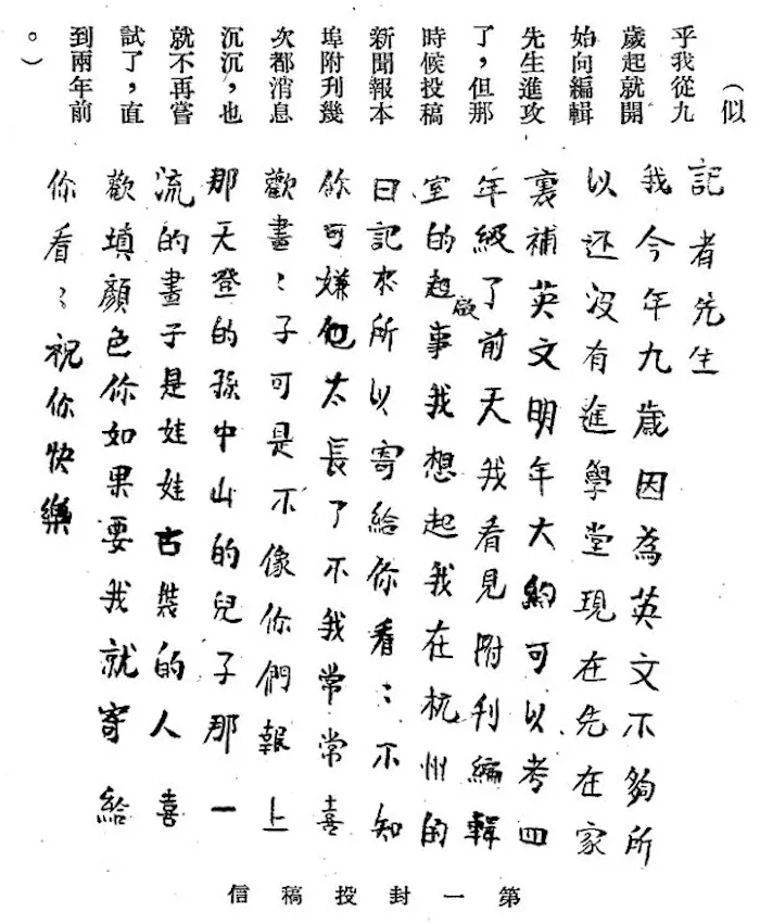 记者先生:我今年九岁,因为英文不够,所以还没有进学堂,现在先在家里补英文,明年大约可以考四年级了。前天我看见“附刊”编辑室的启事,我想起我在杭州的日记来,所以寄给你看看,不知你可嫌太长了不?我常常喜欢画画子,可是不像你们报上那天登的《孙中山的儿子》那一流的画子,是娃娃,古装的人,喜欢填颜色。你如果要,我就寄给你看看。祝你快乐。