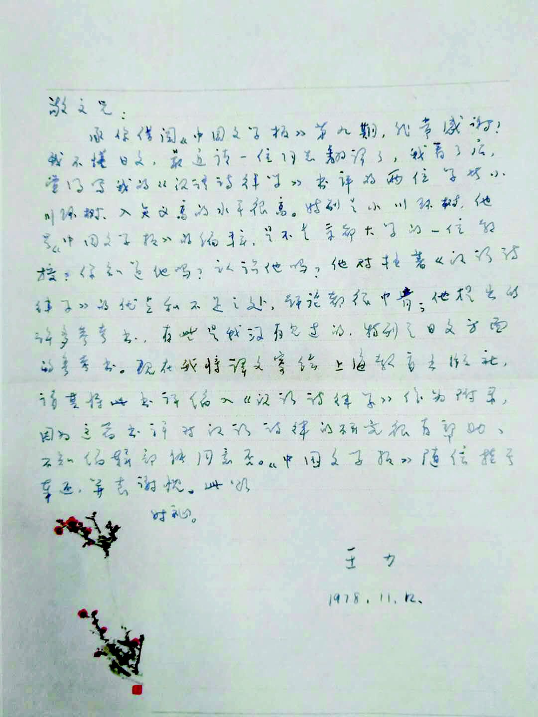 此信写于1978年,主要谈及《汉语诗律学》再版问题,此书是王力先生重要著作。1944年,王力在完成《中国现代语法》《中国语法理论》《中国语法纲要》之后,即开始研究诗歌韵律问题。从1945年至1947年,他历时两年写成《汉语诗律学》,全书70余万字,共分五章,从用韵、平仄、对仗等方面对中国诗、词、曲体裁进行系统叙述、分析,纠正了一些观点,指出容易被忽略的格律问题以及曲的声调特点等,是从语言学角度研究文体特点的开创性著作。因战乱等原因,《汉语诗律学》在1958年由(上海)新知识出版社出版,1962年上海教育出版社出版新一版,不过此版删去原书第五章“白话诗和欧化诗”部分,1979年11月上海教育出版社出版第二版,恢复了原书全貌,并增加部分注释。此后,此书不断再版,后收录于中华书局的《王力全集》,在学术界产生了深远的影响。