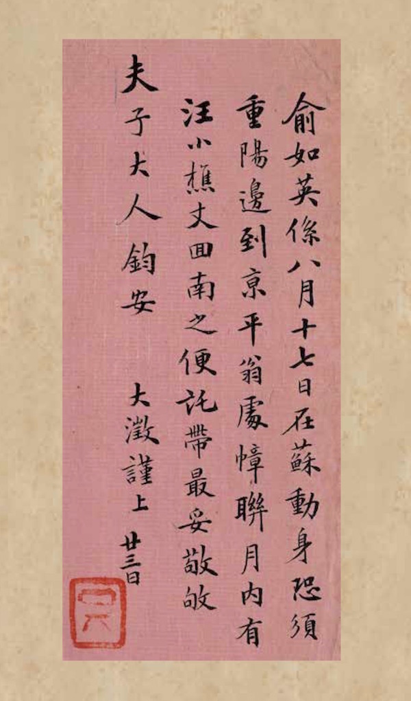 俞如英系八月十七日在苏动身,恐须重阳边到京。平翁处幛联月内有汪小樵丈回南之便托带最妥。敬敂 夫子大人钧安。大澂谨上。廿三日。