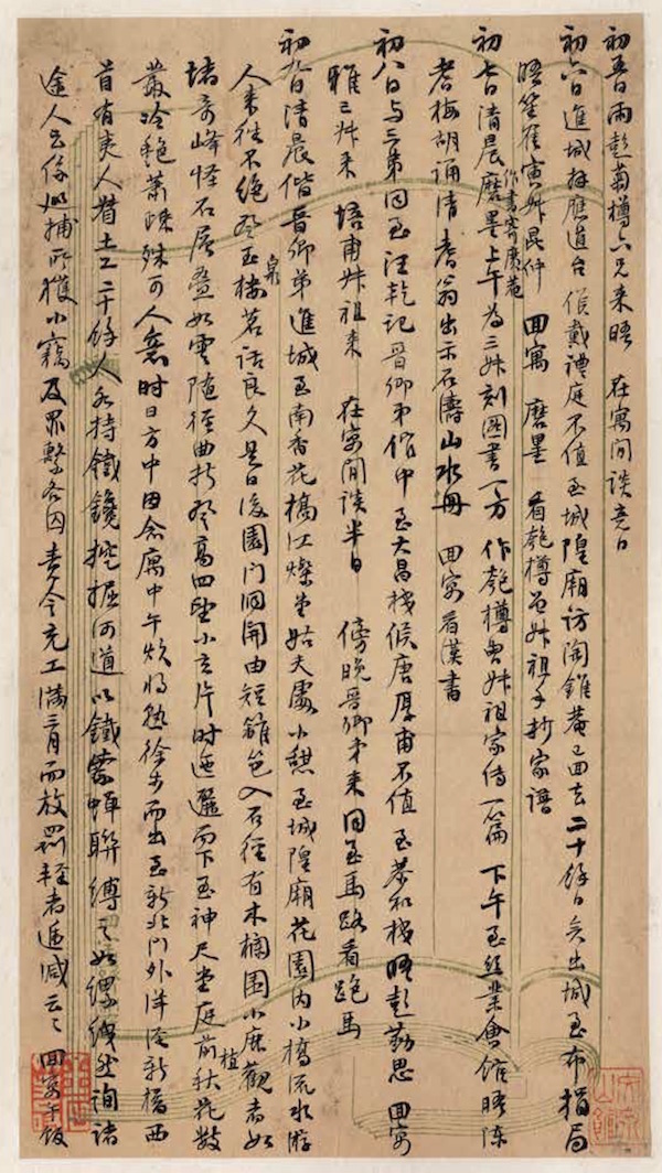 早在同治元年(1861),吴大澂就奉母命,与表弟汪鸣銮偕赴京师,应顺天恩科乡试。他因失利流落在京,遍访同乡戚友,对世道冷暖深有体会,幸好世居葑门南园的彭状元后人彭蕴章(1792—1862)伸出援手,请他到家中坐馆,课读幼子彭祖润(岱霖)。今《乙丑日记》附有吴氏致彭祖润等手札,颇疑此册日记曾经彭氏保存。