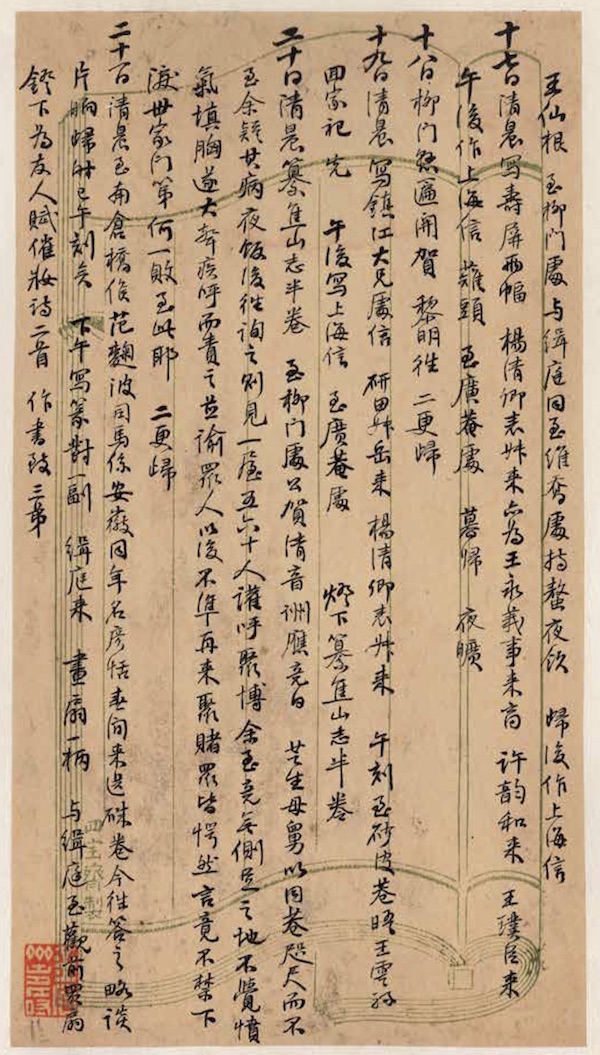 十九日 清晨写镇江大兄处信。研田叔岳来,杨清卿表叔来。午刻至砂皮巷晤王云孙, 回家祀先。午后写上海信,至广菴处。灯下纂《焦山志》半卷。