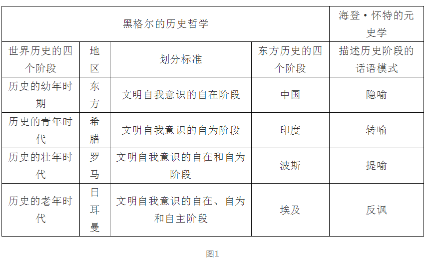 在《元史学》中,海登·怀特指出,黑格尔历史哲学是根据文明自我意识的发展来判定历史阶段的划分标准的。具体来说,世界历史的四阶段分别对应着自我意识的自在阶段,自我意识的自为阶段,自我意识的自在和自为阶段,自我意识的自在、自为和自主阶段。可以说,黑格尔对历史阶段的划分与启蒙有关,而海登·怀特更愿意通过这些阶段,来探讨黑格尔对语言以及意识本身起作用的层次进行考察而产生的概念化。因此,海登·怀特将黑格尔划分世界历史的四个阶段,分别与四种由转义的诸形态表现出的意识模式相对应:(1)历史从野蛮状况过渡到古代东方文化,是意识到隐喻理解的可能性的觉醒。在作为历史童年时代的古代文明中,东方诸国是本质为隐喻的生活与意识模式的范例,而这种理解世界的模式是以单一的隐喻方式将主客体混同的模式;(2)历史从童年时代过渡到青年时代,也就是希腊世界由在有关整体的隐喻式认同之内理解个体的孤立,过渡到肯定作为个性的理想,以此充当自主的依据,而这就是转喻式的理解模式;(3)罗马人相信部分联合整体是可能的,个体在普遍目标之内实现自己的个人目标,表现出提喻的关系模式;(4)当历史进入老年时代,在罗马历史悲剧的结局中暗含着反讽。[25]