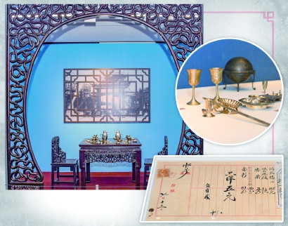 ①鸿运楼的餐桌座椅及餐具。②锦江饭店的各式金属餐具。③1936年的杏花楼菜单。 均本报记者 邢千里摄 制图:冯晓瑜