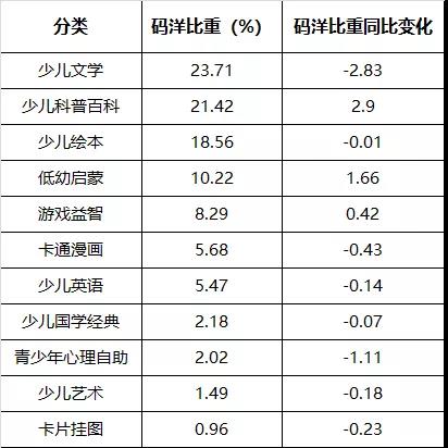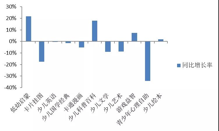 从不同细分市场来看,少儿图书市场中除了低幼启蒙、少儿科普百科、游戏益智、少儿绘本类外,其余类别均出现同比下滑。其中码洋规模较大的少儿绘本和少儿科普百科类同比增长率最大,分别达到21.76%和17.93%,对市场上升拉动作用最明显。青少年心理自助类同比增长率最小,为-34.22%,但其码洋规模较小对少儿整体市场成长性影响不大。