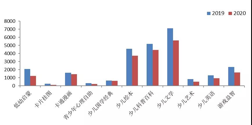 2020年,除了行业自身在追求高质量发展外,受疫情影响少儿图书新书品种规模进一步收缩,全年新书品种数仅有2万,较2019年同期下降了5775种。其中少儿文学类新书品种下降最多,新书品种数同比下降超过1400种,其次是少儿绘本和低幼启蒙类,新书品种数同比下降超过800种,少儿科普百科类的新书品种数下降也超过700种。从新书码洋贡献情况看,少儿新书对少儿整体市场的贡献在不断下降,新书码洋贡献率由2018年的16.02%下降至2020年的8.74%。这和整体市场基本一致,少儿新书也存在驱动力不足问题。