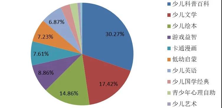 2020年码洋规模最大的前三类依次是少儿文学、少儿科普百科和少儿绘本,码洋比重分别为23.71%、21.42%和18.56%。与2019年相比,少儿科普百科、低幼启蒙和游戏益智类的码洋比重出现上升,其中少儿科普百科类上升最大,码洋比重同比上升了2.9个百分点,其次是低幼启蒙类,码洋比重同比上升了1.66个百分点。少儿文学、青少年心理自助和卡通漫画等类别的码洋比重有所下降,其中少儿文学类下降最多,下降了2.83个百分点。