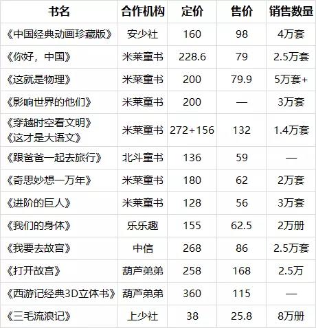 与此同时,一些专注少儿图书出版的中小型童书工作室开始崛起,如狐狸家、米莱童书、段张取艺等机构。这些机构成立时间不长,并且以一个小的品类切入童书市场,自主研发童书,都有畅销的代表作。成立2年半米莱童书(品牌故事请戳)专注于少儿科普领域,自主研发了12套图书,其销量均超过5万套;合肥狐狸家(品牌故事请戳),成立3年,出版的《西游记绘本》累计销量60万册;《哇!历史原来是这样》上市一个月销售突破10万册。