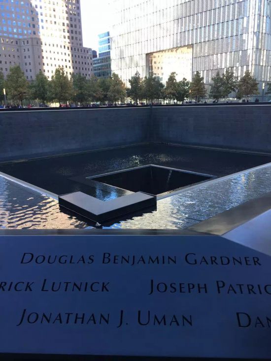 缓缓流淌的水,是那些曾经鲜活的生命。纪念喷泉池那庄重的黑色大理石和深入地下的池底,是凝重的祭奠,让那天逝去的人们在死亡中得享尊严。