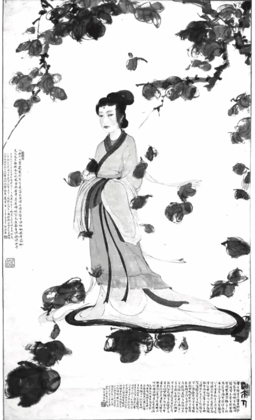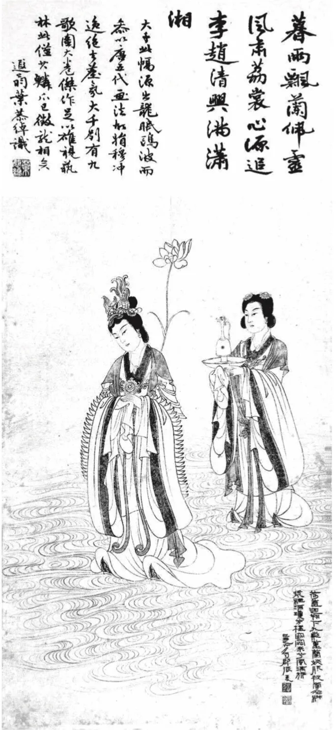 ÕÅ´óǧ×÷ÓÚ1949Äê6Ôµġ¶Ïæ·òÈËͼ¡·£¬ÊÇÆä´´×÷·ç¸ñ³ÉÊìʱÆÚµÄ×÷Æ·£¬¸üÊÇÆäÈÚ»¯Àú´úÓÅÐã»·çµÄ½á¾§¡£´ËͼÒâ¾³Ö÷Ҫȡ²ÄÓÚ¡¶Ïæ¾ý¡·¡¶Ïæ·òÈË¡·Á½Æª£¬ÕÅ´óǧÔÚ»ÉϱêÓÐÌâʶ£º¡°ºÉ¸Ç»ØÏèϾÅáÚ£¬Þ¥À¼½¿·þ±»ÔÆÒ¡£½·½¬¹ð¾ÆÇí·¼˜}£¬ñºñ»À´Ùâ·çÂúÆì¡£¼º³óÖ®ÁùÔ£¬Êñ¿¤ÕÅ뼡£¡±ºÜÃ÷ÏÔ£¬¸Ãͼ³Ê¶µÄÊǵäÐ͵ġ¶³þ´Ç¡·ÒâÏ󣬶øÆä¶ÔÏæË®¶þÉñµÄÃ軣¬È´Ò»¸Ä´«Í³»æ»Öн¿Èõ²øÃàµÄÐÎÏó¶ø³ÊÏÖ½¡ÀÊÃ÷´ïÖ®ÃÀ¡£Ò¶¹§´Â³ÆÔÞµÀ£º¡°ÄºÓêÆ®À¼Å壬Áé·çËàÀóÉÑ¡£ÐÄÔ´×·ÀîÕÔ£¬ÇåÐËÂúäìÏæ¡£´óǧ´Ë·ùÔ´³öÁúÃߟ²¨£¬¶ø²ÎÒÔÌÆÎå´ú»·¨£¬¹Ê¾êijåÒÝ£¬¾øÈ¥³¾·Õ£¬´óǧ±ðÓС¶¾Å¸èͼ¡·´ó¾í½Ü×÷£¬×ãÒÔÐÛÊÓÒÕÁÖ£¬´Ë½öÆäÁÛצ£¬ÒÑÕ÷ÁúÏàÒÓ¡£¡±ÕâÀï̸µ½¡°´óǧ±ðÓоŸèͼ´ó¾í½Ü×÷¡±£¬µ±ÊÇÖ¸ÆäÔÚ1945ÄêÖÁ1946ÄêÁÙÄ¡ÕÔÃÏî/n1/2021/0205/×÷Æ·¶ø³ÉµÄ¡¶¾Å¸èͼ¡·³¤¾í¡£Ò¶¹§´ÂµÄÕâ¶Î»°¶Ô¸ÃͼÒÕÊõ·ç¸ñµÄËÝÔ´¿Éν¾«µ½£¬ËûÖ¸³ö´ËͼÓÐÀ÷ë¡¢ÕÔÃÏî/n1/2021/0205/µÄÁ½Ëηç¸ñ£¬¸üÓÐÌÆÎå´ú»·¨£¬ÍêÕûµØµÀ³öÁËÕÅ´óǧµÄʦ·¨Ô¨Ô´¡£Àî¡¢ÕÔ¶þÈ˽ÔÊÇѧϰǰÈ˵ĸßÊÖ£¬´Ó¼¼·¨Óë·ç¸ñÉÏÈ«Ãæ×ð³ç½ú¡¢ÌÆ·ç¸ñ£¬ÕâÓëÕÅ´óǧµÄÒÕÊõ×·ÇóÏà°µºÏ¡£ËùνµÄÌÆÎå´ú»·¨£¬Ö¸ÕÅ´óǧ´Ó¶Ø»Í»æ»Ñ§Ï°µ½µÄ»æ»¼¼ÒÕÓ뾫ÉñÆøÖÊ¡£ÕÅ´óǧµÄÈËÎﻣ¬ÔçÆÚ·ç¸ñϸÈá¾êÀö£¬ÖÐÄêѧϰ¶Ø»Í±Ú»ºóתÏò»ªÃÀ½¡Ë¶£¬ºóÀ´ÓÖÈÚ»á¶à¼Ò£¬×Ô³ÉÒ»ÅÉ¡£
