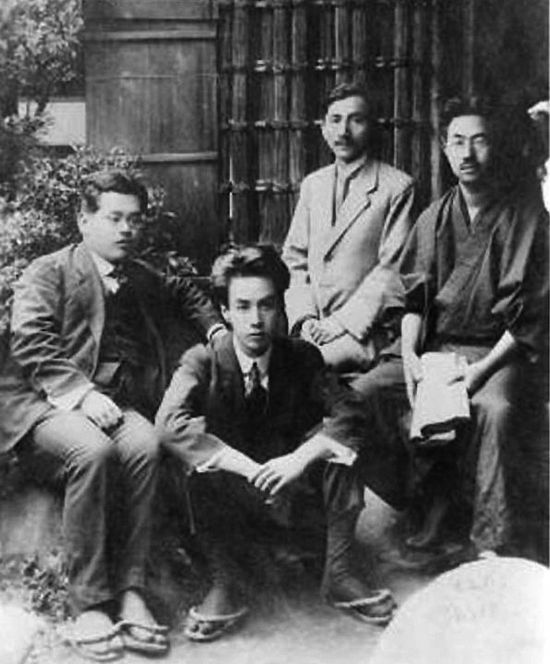 1919年,芥川龙之介与友人,中间蹲坐者为芥川龙之介,照片最左边者为菊池宽。