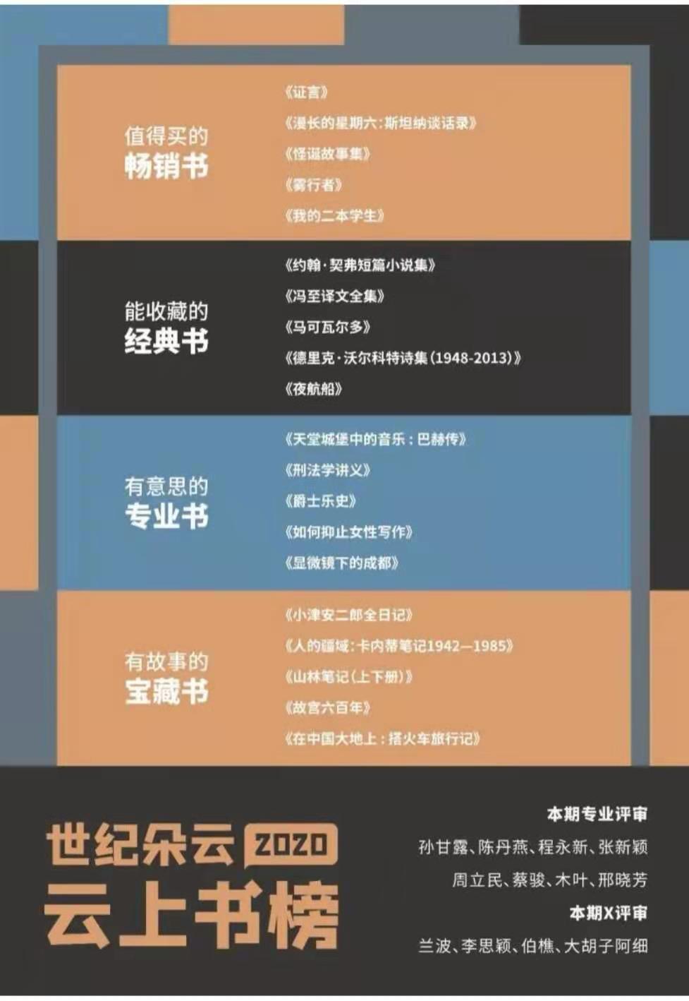 从2020年9月起, “云上书榜”至今已经评选出六期榜单。年榜评选范围是2020年出版的图书,候选书单由前六期的上榜图书和评审们的补充书单组成。最终评选出4大类别共20本上榜图书。其中,“值得买的畅销书”是《证言》《漫长的星期六:斯坦纳谈话录》《怪诞故事集》《雾行者》《我的二本学生》;“能收藏的经典书”是《约翰·契弗短篇小说集》《冯至译文全集》《马可瓦尔多》《德里克·沃尔科特诗集(1948-2013)》《夜航船》;“有意思的专业书”是《天堂城堡中的音乐 : 巴赫传》《刑法学讲义》《爵士乐史》《如何抑止女性写作》《显微镜下的成都》;“有故事的宝藏书”是《小津安二郎全日记》《人的疆域:卡内蒂笔记1942—1985》《山林笔记(上下册)》《故宫六百年》《在中国大地上 : 搭火车旅行记》。