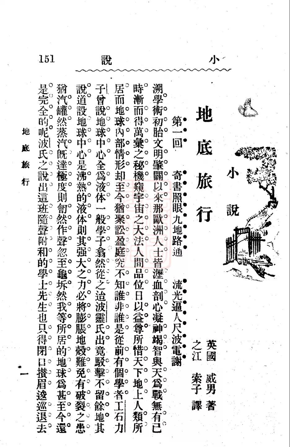 鲁迅与科幻小说的关系,也是从1902年开始的。当年,他将凡尔纳的小说《月界旅行》进行译介。次年,鲁迅继续在《浙江潮》刊登新的凡尔纳小说译本《地底旅行》。《月界旅行》为章回体小说,除标题外,作者严格按照原文的内容进行翻译,没有像梁启超那样根据自己喜好进行名词转移,准确的翻译风格恰当地传递了凡尔纳《月界旅行》的基本精神。