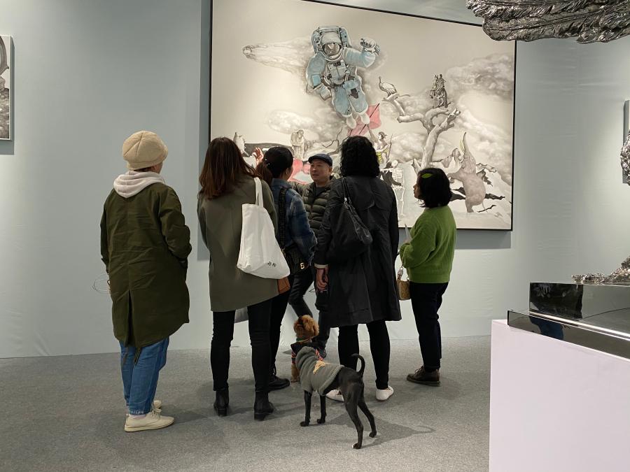 步入展馆,位于展厅中央的一幅长3米、宽2米的油画吸引了不少观者驻足欣赏,这幅作品名为“后伊甸园”,画作以宇航员、动物、生命与死亡等为创作意象,用科幻与艺术相结合的手法展示了对人类历史与发展的思考。