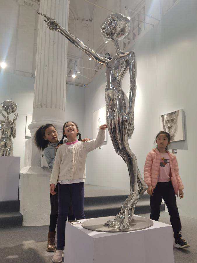 “妈妈,你看那站着一个外星人!”一位观展的女孩指着一尊外星人雕塑说。展厅内,这尊外星人雕塑矗立在几根白色古罗马柱间,阳光透过拱窗照在不锈钢质地的雕塑上,反射出冷冽的金属光泽。“现代的雕塑精美又特别,和传统建筑的展厅形成强烈对比,激发了我对宇宙的思考和想象。”观展的陈先生表示,这样的当代艺术展很新奇。