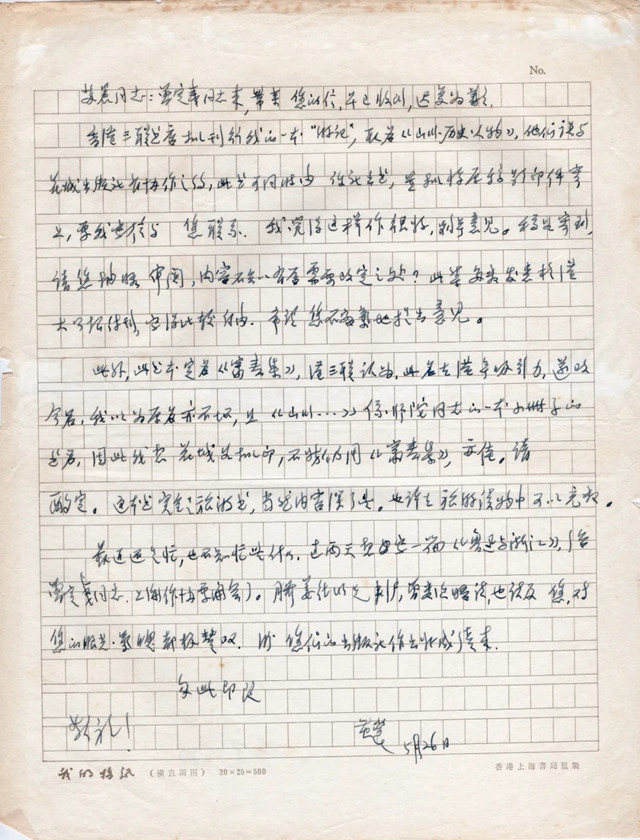 香港三联书店拟刊行我的一本“游记”,取名《山川·历史·人物》,他们说与花城出版社有协作之约,此书可同时由你社出书,并拟将原稿影印件寄上,要我写信与您联系,我觉得这样做很好,别无意见。稿如寄到,请您抽暇审阅,内容不知有否需要改定之处?此集多数发表于港《大公报》副刊,写得比较自由,希望您不客气地提出意见。