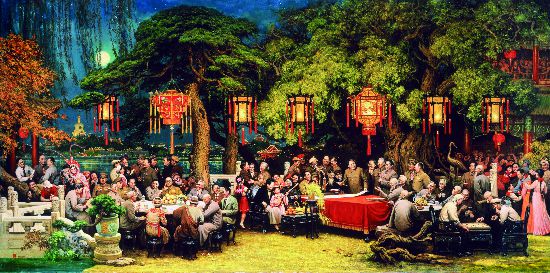 整幅画以1950年10月3日毛泽东与柳亚子和词的史实为原型。画面中,开国元勋、民主党派代表、爱国人士和文化教育科技等方面的杰出人物,云集在宫灯高挂的中南海庭院,吟诗作画,品茗倾谈,共度良宵佳节,欢庆新中国的民族团结和伟大胜利。