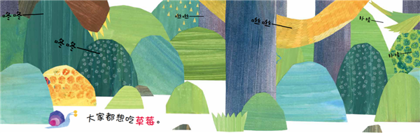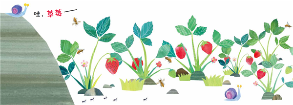 《好想好想吃草莓》讲述了一只有勇气、有毅力的小蜗牛想吃草莓的故事。一只小蜗牛出发寻找草莓,一路上,它遇见一只又一只动物,它们都劝小蜗牛不用去了,因为它们没有找到草莓。经过一番考虑,小蜗牛还是决定继续寻找草莓。不分白天和夜晚,不管晴天还是雨天,它仍然坚持赶路。终于,小蜗牛越过山丘,看到了一大片又大又红的草莓。