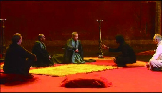 2000年上演的《哈姆雷特的悲剧》舞台简洁清晰、现场充满律动感,被拉文德视为布鲁克职业生涯的最高点。首先是场景的设置和演员的选择展现了典型的布鲁克剧场风格,舞台只有一块红色的地毯,地毯周围有一些绿色、黄色和黑色的垫子,舞台后端有两张长方形的凳子,凳子上也盖着红布。这样的舞台是符合布鲁克关于舞台空间的理论的,也符合他对于莎士比亚戏剧的理解。在那样庞大的主题面前,只有空白最为恰到好处,空白的景给予了演员和角色最大的空间。在演员的选择上,来自不同种族的八名演员参与了表演,哈姆雷特由黑人演员阿德里安莱斯特(Adrian Lester)扮演。