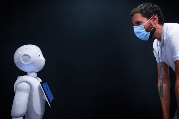 2020年9月10日,在法国巴黎的软银机器人公司,机器人Pepper展示检测人们是否正确佩戴口罩的功能。软银机器人Pepper通过自带的摄像头扫描人脸,检测对方有没有佩戴口罩,并给予礼貌提醒和指导。新华社发(奥雷利安·莫里萨尔摄)