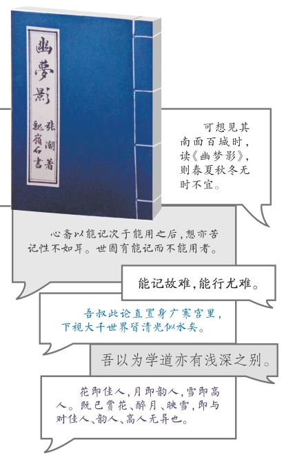 《幽梦影》作者系明末清初文学家张潮,有名文化之地徽州(今安徽歙县)人,其著述甚多。此书倘归类,应该是笔记随感一路:天地自然、人生况味、庭院花草、阅书心得……几乎无所不谈,还大都是以人们喜欢的格言、联语形式。作者内在灵动,并不书卷气,故笔下有味,许多还有趣。这些可以引发读者兴趣的因素外,还出现了古书十分少见的“跟帖”:在几乎所有章节之后,有少者三两人,多达四、五或更多人加以评说:附和、打趣……这些评说者,从表达看,与张潮性情相近。他们文字大都精粹,也尽量在有趣有味上下功夫,虽为评语,可运笔老到,与原作搁一起,常常有彼此映照、互为生发之效,这让读者观阅时,更加一层感兴之愉悦。