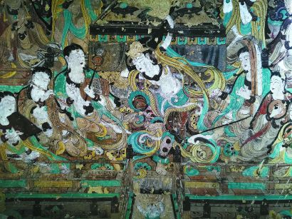 敦煌西魏、北周时期的洞窟壁画中的飞天形象,继承北凉、北魏多用写意的画法。这一时期的壁画精彩而自由,看似大杂烩般的中西艺术形象混杂,实则体现文化融合的初貌。莫高窟249窟(西魏)北壁说法图中,同时出现了中原式和西域式的两种飞天。中原式飞天面目清秀,身穿红色汉服,衣领处青色镶边,飘带亦是青绿色,凌空起舞;西域式飞天,“小”字脸,裸露上身,下着白色紧身裙,手握飘带。285窟(西魏)飞天画法呈现中原风格,秀骨清像,勾线填色,发型为中原的双发髻造型,持箜篌演奏,姿态优美生动。这一造型与山西九原岗墓室壁画中的驾鹤仙人在造型和画法上有着高度的相似性。