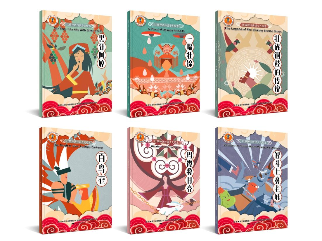 “壮族神话传说少儿绘本”系列图书,由广西美术出版社出版,以壮族神话传说故事为题材,共六册,每册讲述一个壮族神话传说,分别为《百鸟衣》《黑牙阿婷》《一幅壮锦》《玛霞救月亮》《智斗七鼻老妖》《壮族铜鼓的传说》。