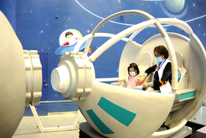 2021年5月19日,小朋友由家人陪同在中国科学技术馆体验“飞船对接运行” 。新华网发(刘广生 摄于北京)