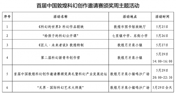 据了解,本次邀请赛颁奖周主题活动为期六天,包括“科幻的世界”科幻影视作品联展、“给孩子的科幻公开课”想象力讲座、科普中国《未来者说》敦煌匠人特制、科幻沙龙、科幻新青年创作营、科幻产业发展论坛等多项活动。科学与幻想成长基金理事长马国宾在接受采访时曾表示:“科幻基金来到了文化沃土甘肃,就是要通过科幻创作这样的当代表达深入挖掘城市历史文化价值,提炼精选一批凸显文化特色的经典性元素和标志性符号,为甘肃的传统文化提供创造性转化和时间发展,推动和促进本地科幻文化产业以及版权产业的培育和发展。”