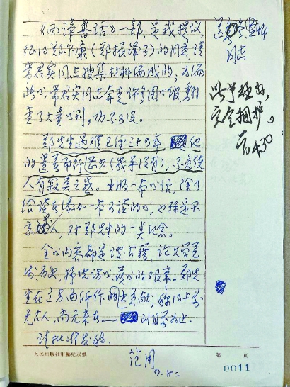 《晦庵书话》之后,又有郑振铎的《西谛书话》。三联书店留存下来的这本书的书稿档案中的“审读意见”是范用亲自写的:
