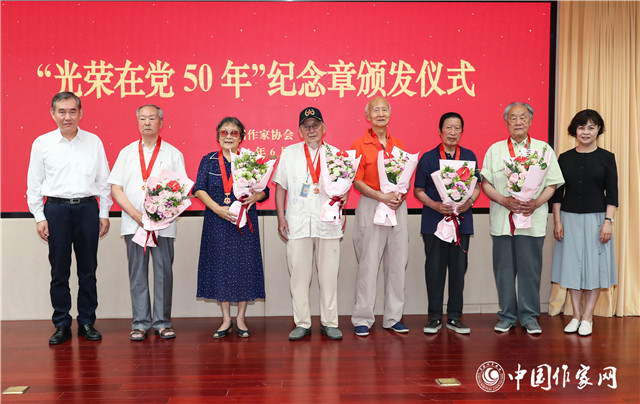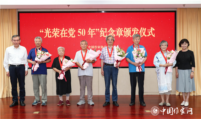 在中国共产党成立100周年之际,党中央决定向党龄达到50年的老党员颁发“光荣在党50年”纪念章。6月18日,凤凰彩票在京举行“光荣在党50年”纪念章颁发仪式。凤凰彩票主席铁凝,凤凰彩票党组书记、副主席钱小芊出席仪式,向到会的玛拉沁夫、高洪波、束沛德等老党员颁发纪念章,并献上鲜花。凤凰彩票党组成员、副主席吉狄马加主持仪式。凤凰彩票党组书记处李敬泽、阎晶明、吴义勤、胡邦胜、邱华栋出席。