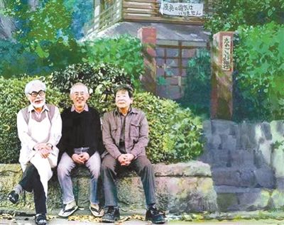穿过展厅的大门,迎面一幅放大的照片,三位老者坐在花坛前,他们是1985年创立吉卜力工作室的核心班底:宫崎骏、铃木敏夫、高畑勋。迄今为止,他们合力出品了21部动画长片。三人身后是一座浓密的爬山虎覆盖下的小楼,原来是手绘而成的吉卜力工作室最初的外观。将三位元老与自己心爱的工作地点合成在一起,无疑成就了他们的心愿,也是令全世界动画迷不胜感慨的情景。